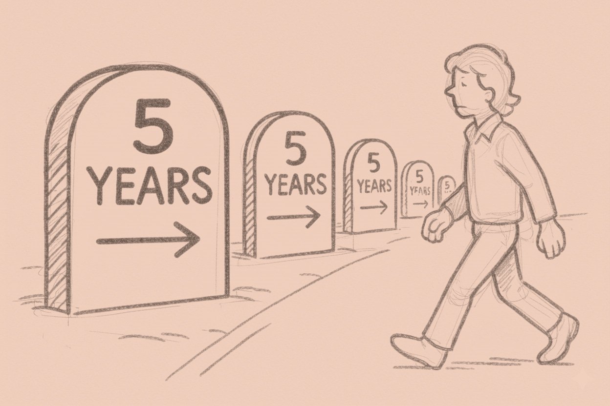 And we keep walking toward it, announcing progress, marking milestones, resetting the timeline. Five years. Always five years.
